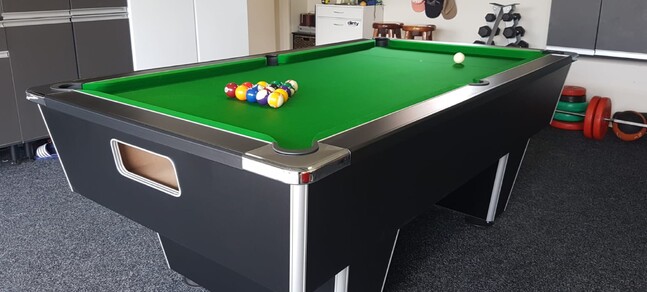This is the Club Pool Table in Black and Green with Strachan 6811 Cloth and a full set of accessories. It is a UK specification, 7ft Pool Table and is available now with free delivery and installation to most parts of the Algarve. Get in touch to find out more.