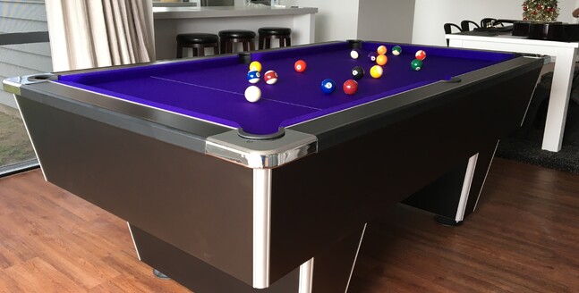 This is the Club Pool Table in Black and Purple. It's a 7ft slate bed pool table manufactured in the UK and comes with Strachan 6811 cloth. Keen to know more ? Call us on 917846242 and we can tell you which cloth colours and table finishes are available for immediate delivery. We close for our holidays on 21st December so if you are keen, then jump to it. Thanks.
