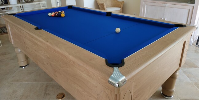 We are the number one retailer of slate bed pool tables in the Algarve. This one is the Prince Pool Table in Oak and Blue. It is manufactured in the UK, supplied with a full set of accessories and free "local to Almancil" delivery and assembly. Get in touch to find out more.